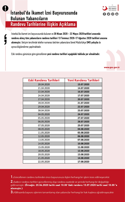 Göç İdaresi Tarafından 19.03.2020 tarihinde yapılan duyuruda; İstanbul’da ikamet izni başvurusunda bulunan ve 19 Mart 2020- 22 Nisan 2020 tarihleri arasında randevu almış olan yabancıların randevu tarihleri 01.06.2020-30.06.2020 tarihleri arasına alınmıştır. Genel Müdürlükçe SMS yoluyla da ayrıca bilgilendirme yapılacaktır. Bu duyuruya göre:19.03.2020 tarihinde randevusu olan bir yabancı 01.06.2020 tarihinde randevuya gidecektir ve takip eden randevular 01.06.2020’den sonraki iş günlerini takip edecektir. 20.03.2020 tarihinde randevusu olan yabancı 02.06.2020 tarihinde, 23.03.2020 tarihinde randevusu olan yabancı 03.06.2020 tarihinde randevuya gidecek ve diğer tarihler sırayla bu tarihleri takip edecektir.