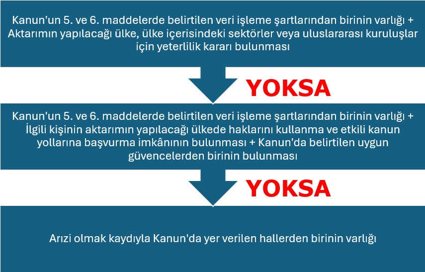 Yeni düzenleme ise yurt dışına veri aktarımı için kademeli bir sistem öngörmektedir. Yani kişisel verilerin yurt dışına aktarımı noktasında her bir aktarım şartının mevcut olup olmadığı tek tek incelenecek ve diğer aktarım şartına eğer bir üstteki bulunmuyorsa gidilecektir. Diğer bir deyişle aktarım şartları arasında hiyerarşi düzenlenmiştir.